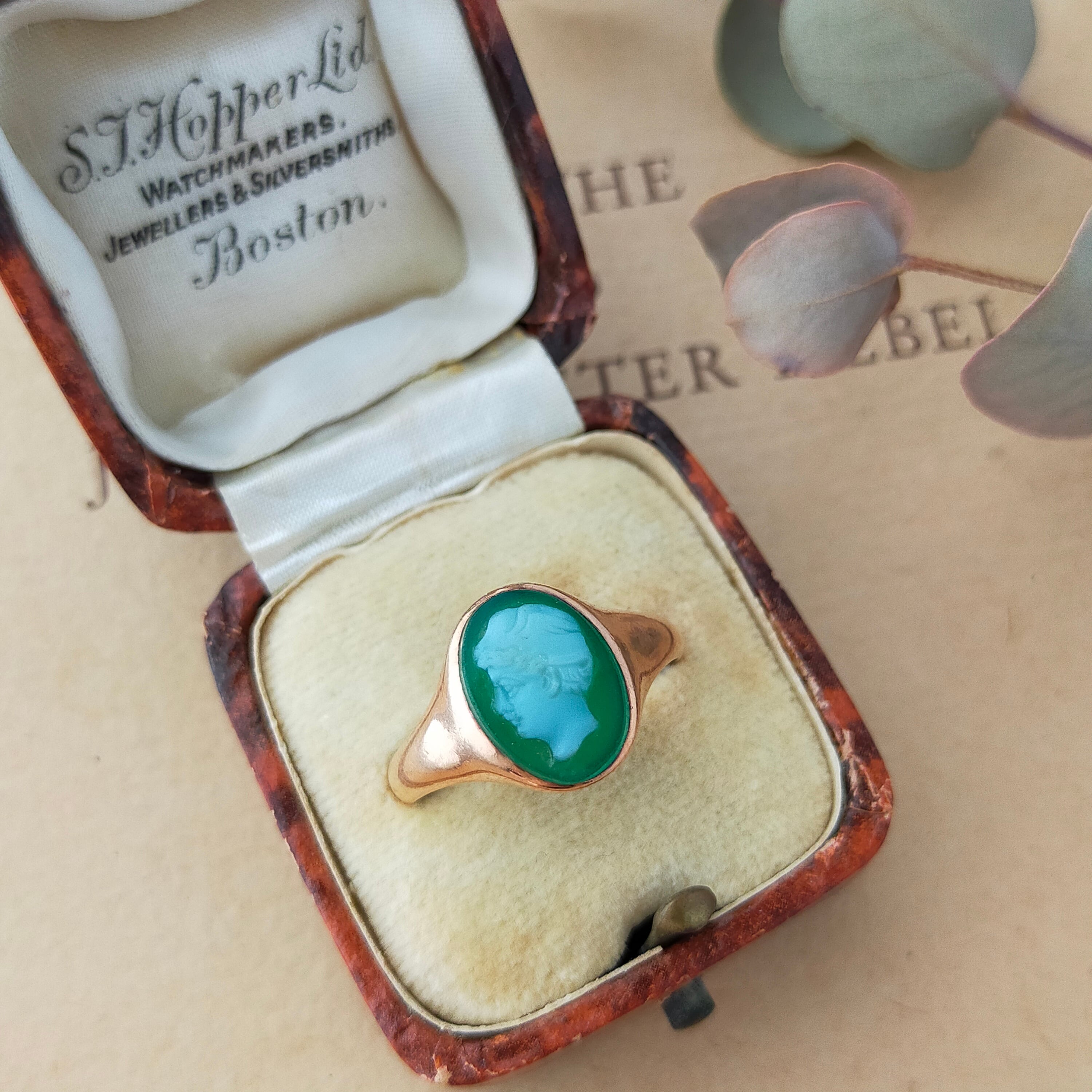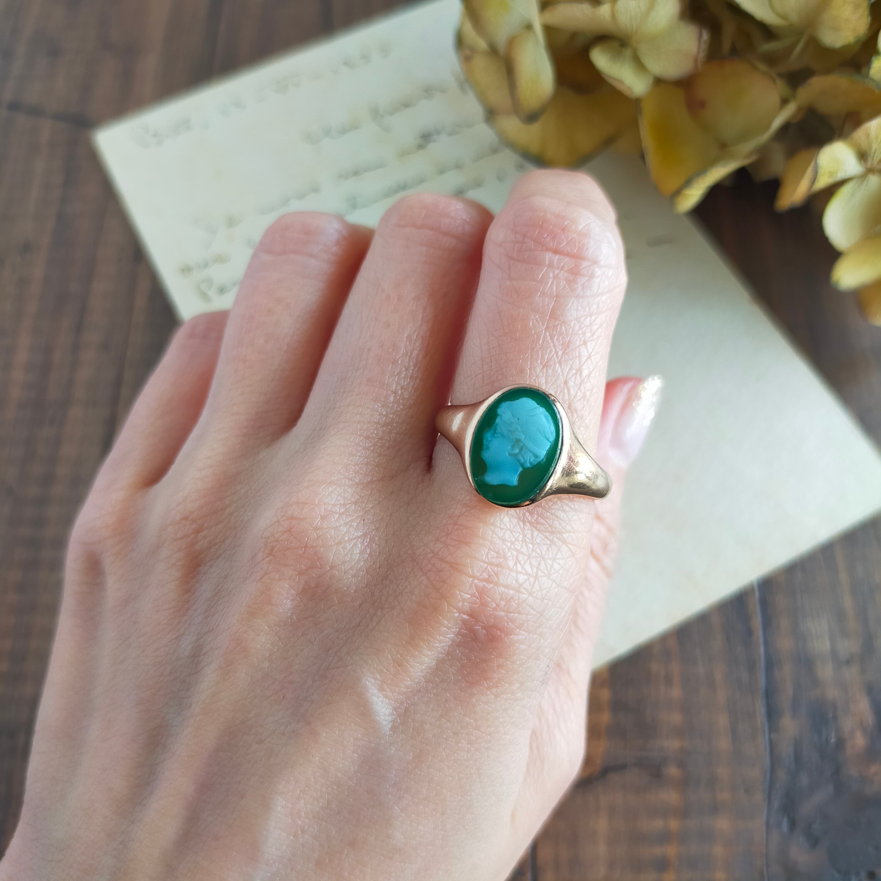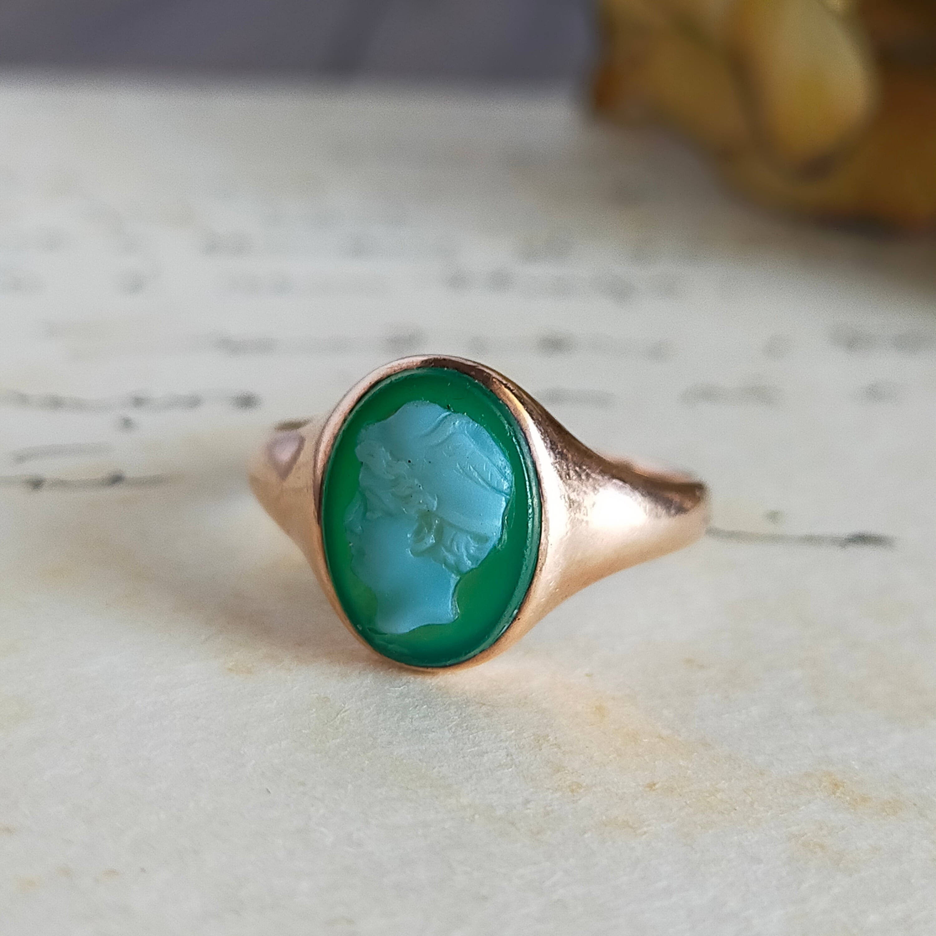 グリーンアゲートに男性の横顔が描かれた珍しいカメオのアンティークシグネットリング
