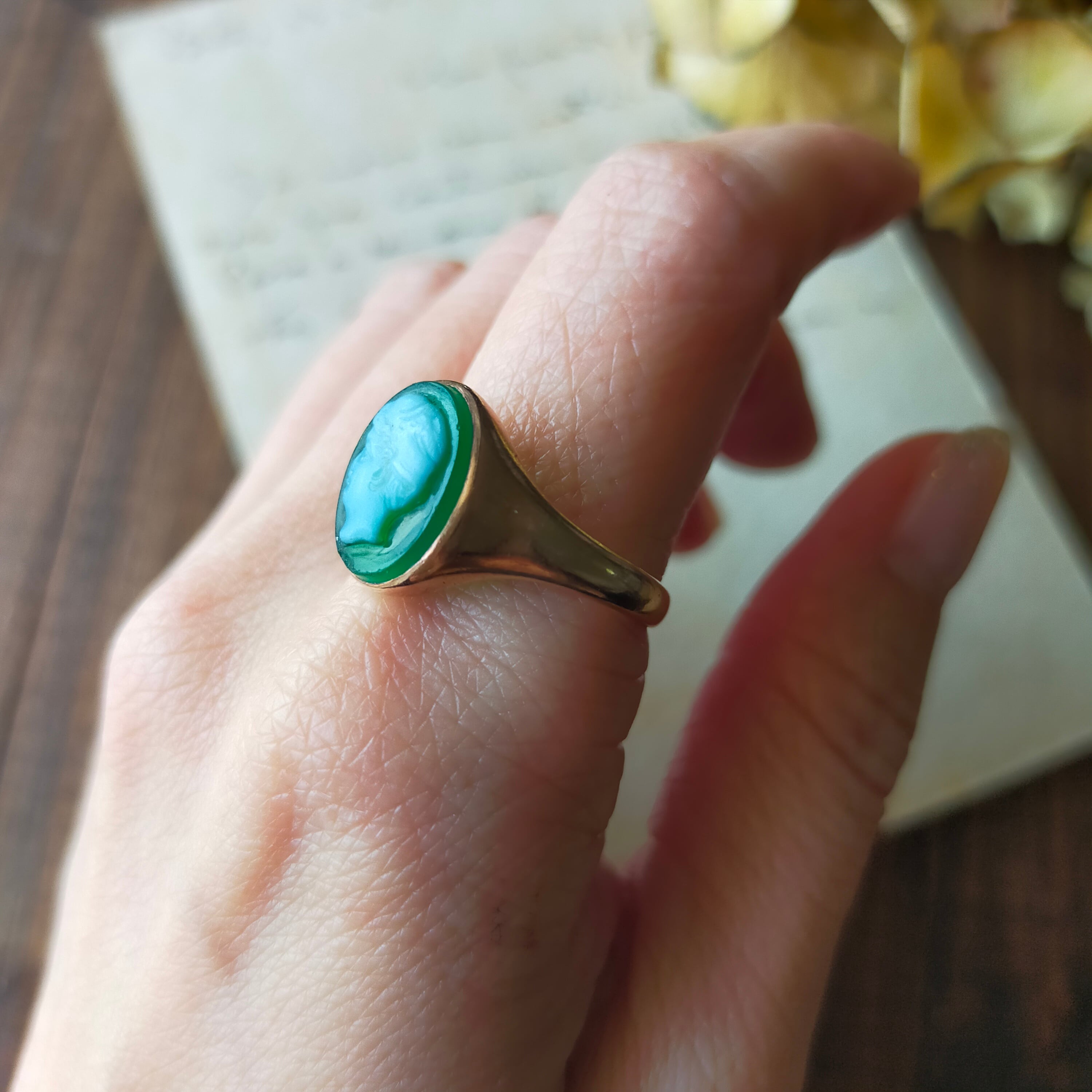 目をひく鮮やかなグリーンの美しいカメオは視界に入る度安らぎと癒しをくれます。