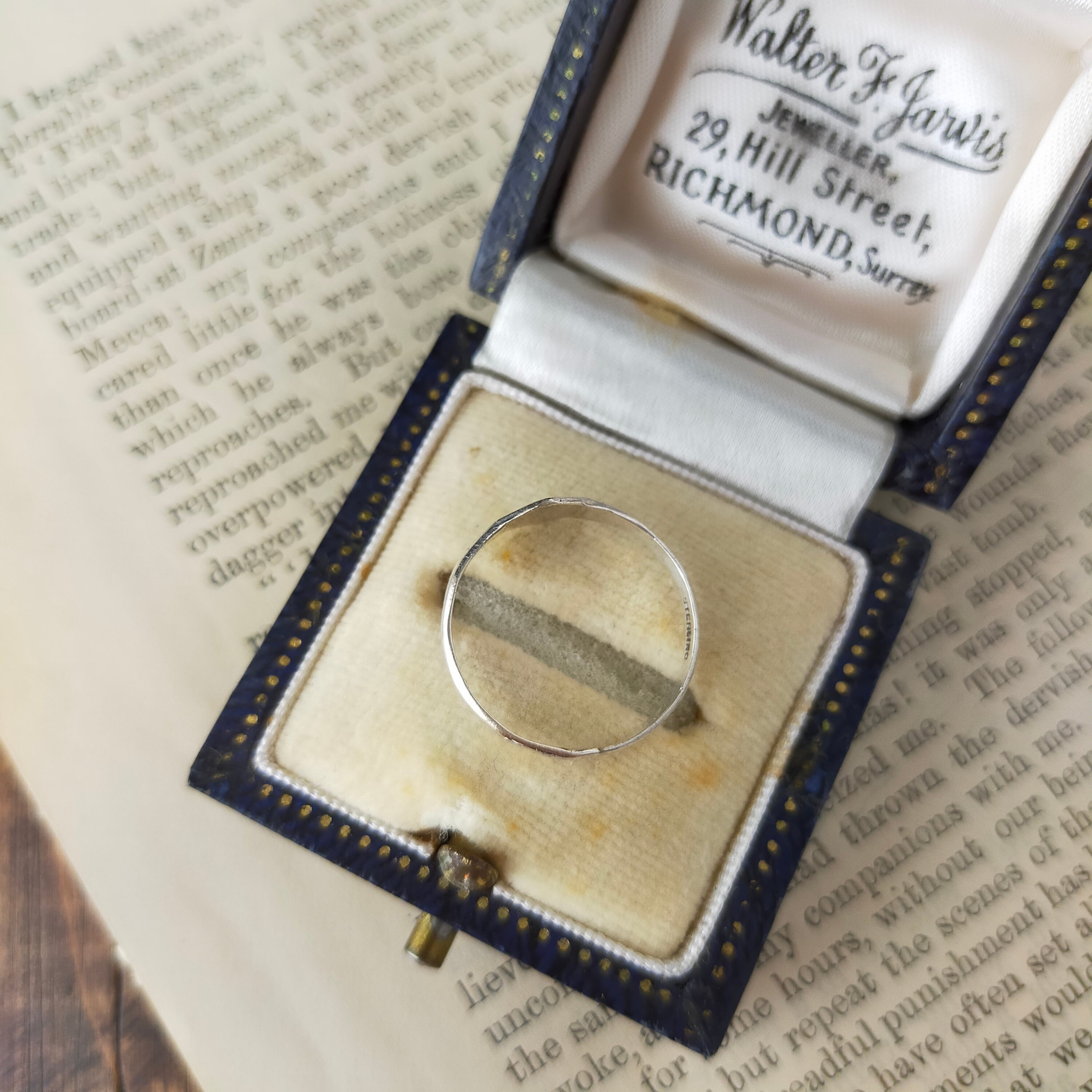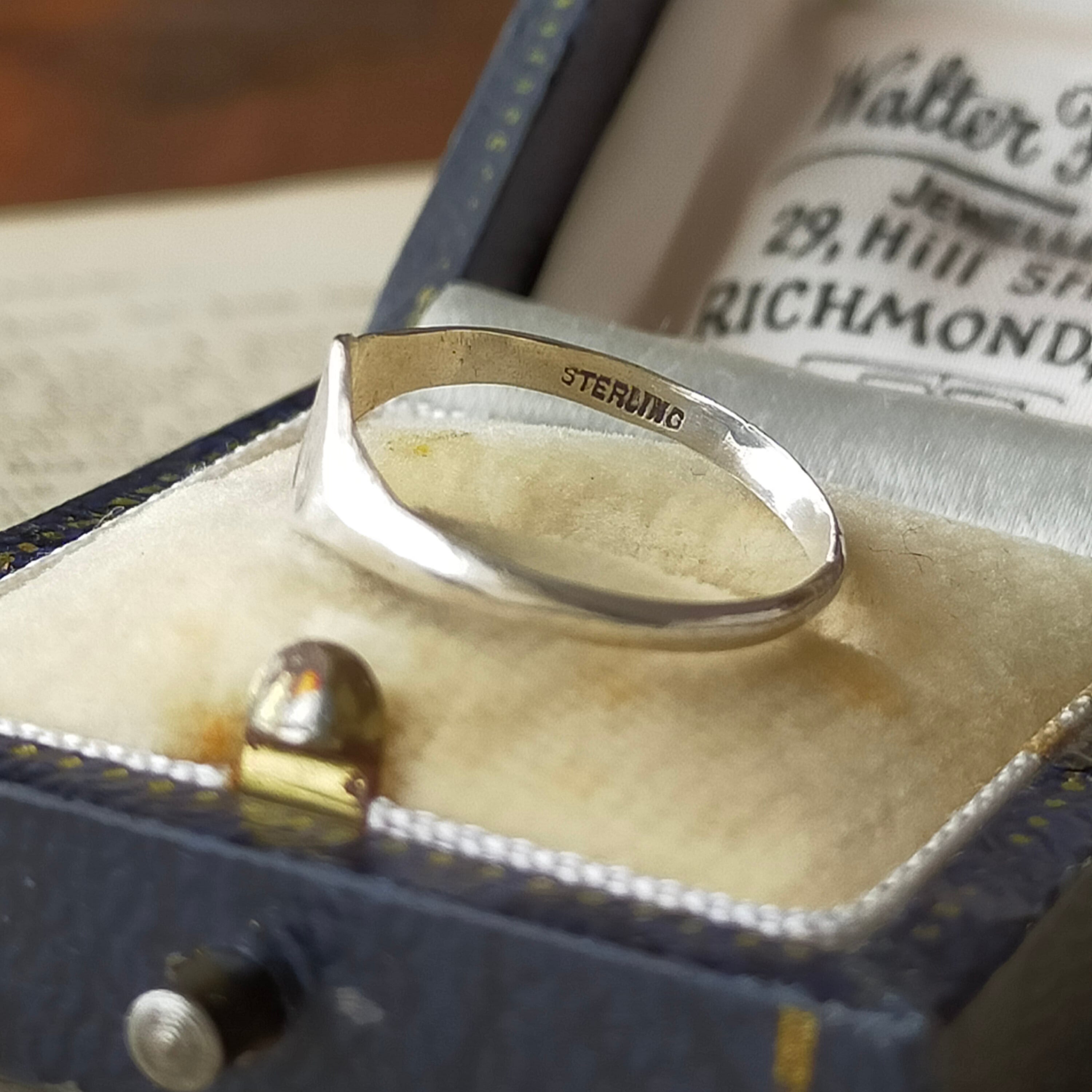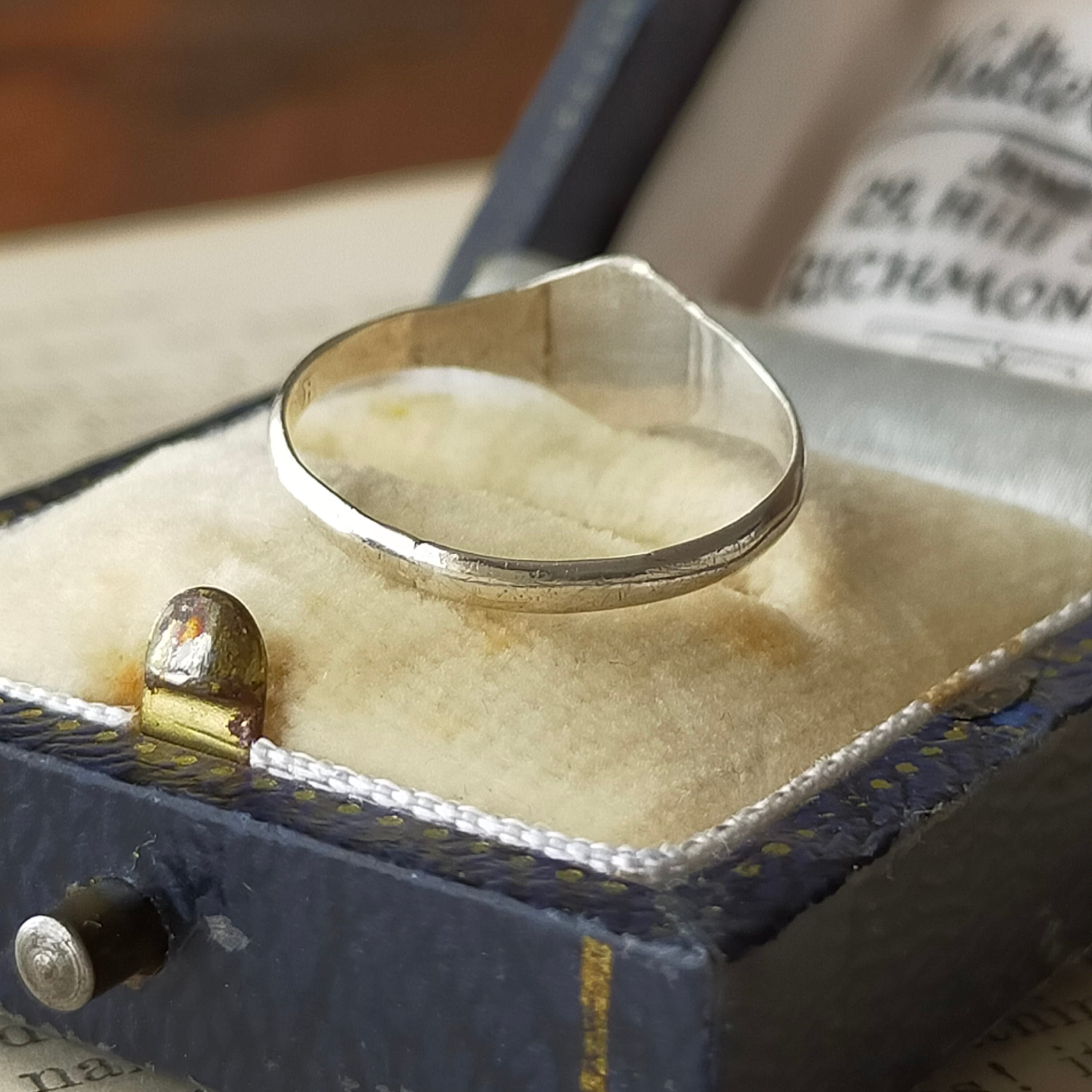 デザインや細工の特徴から、1920~1930年ごろに作られたアンティークのシルバーリングと考えられます。