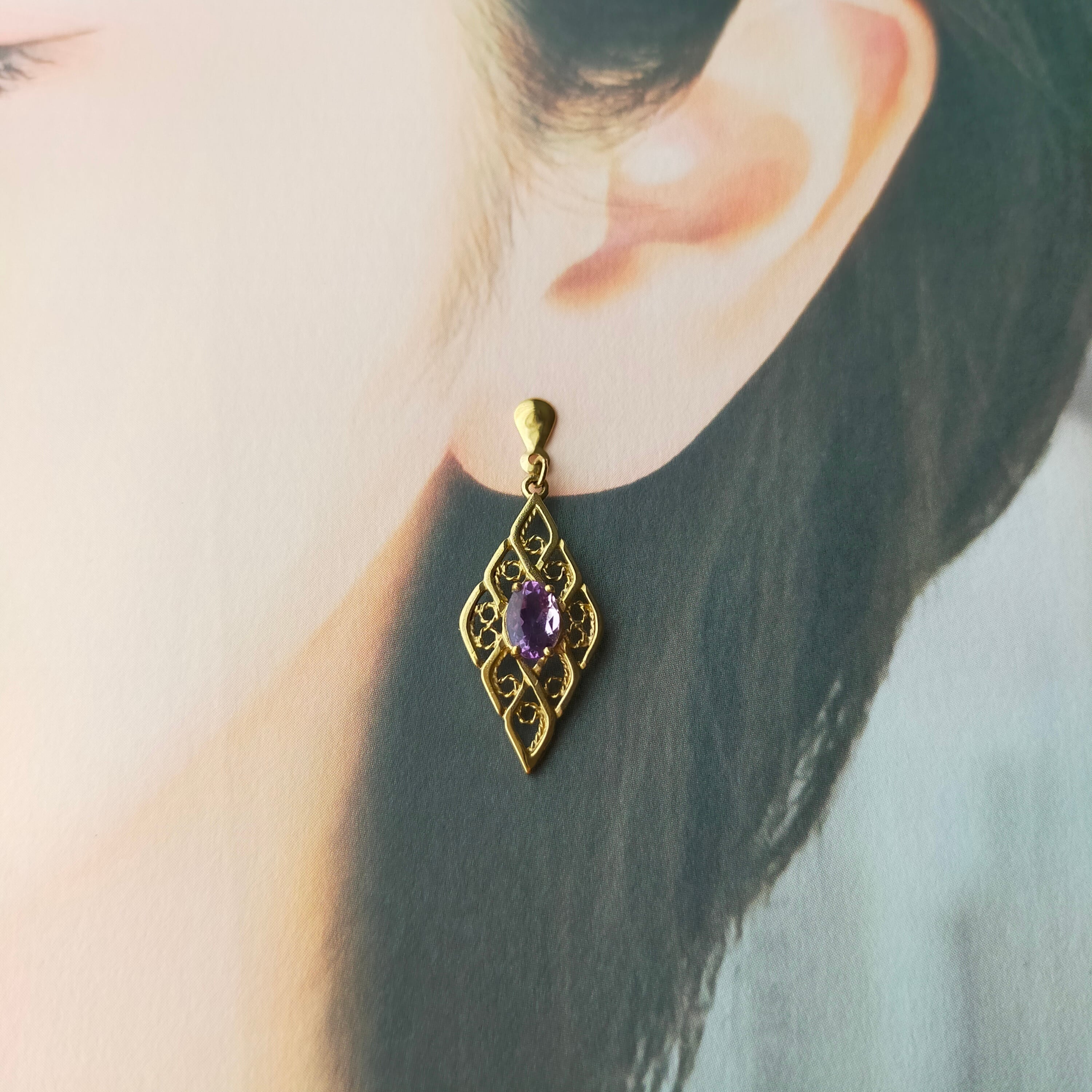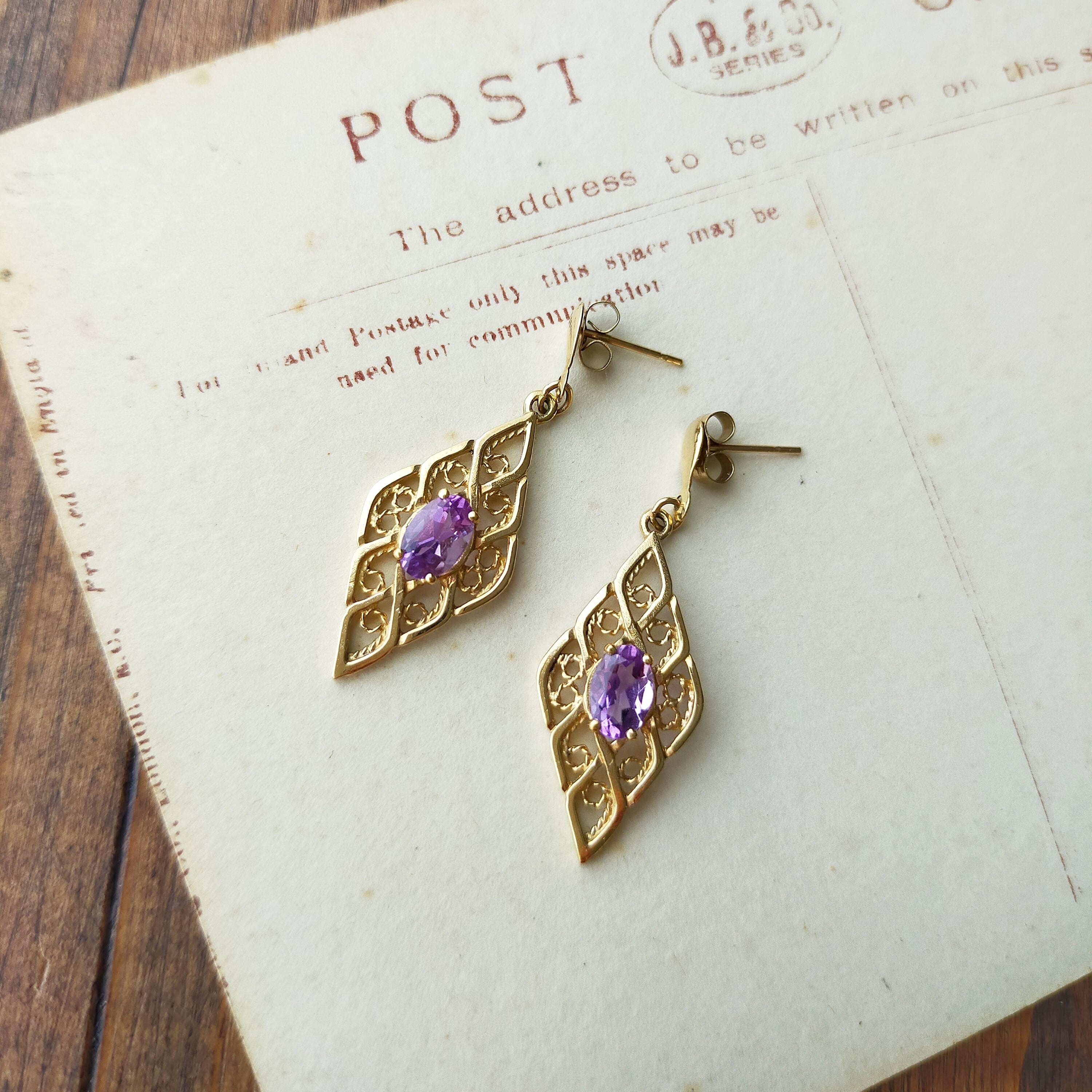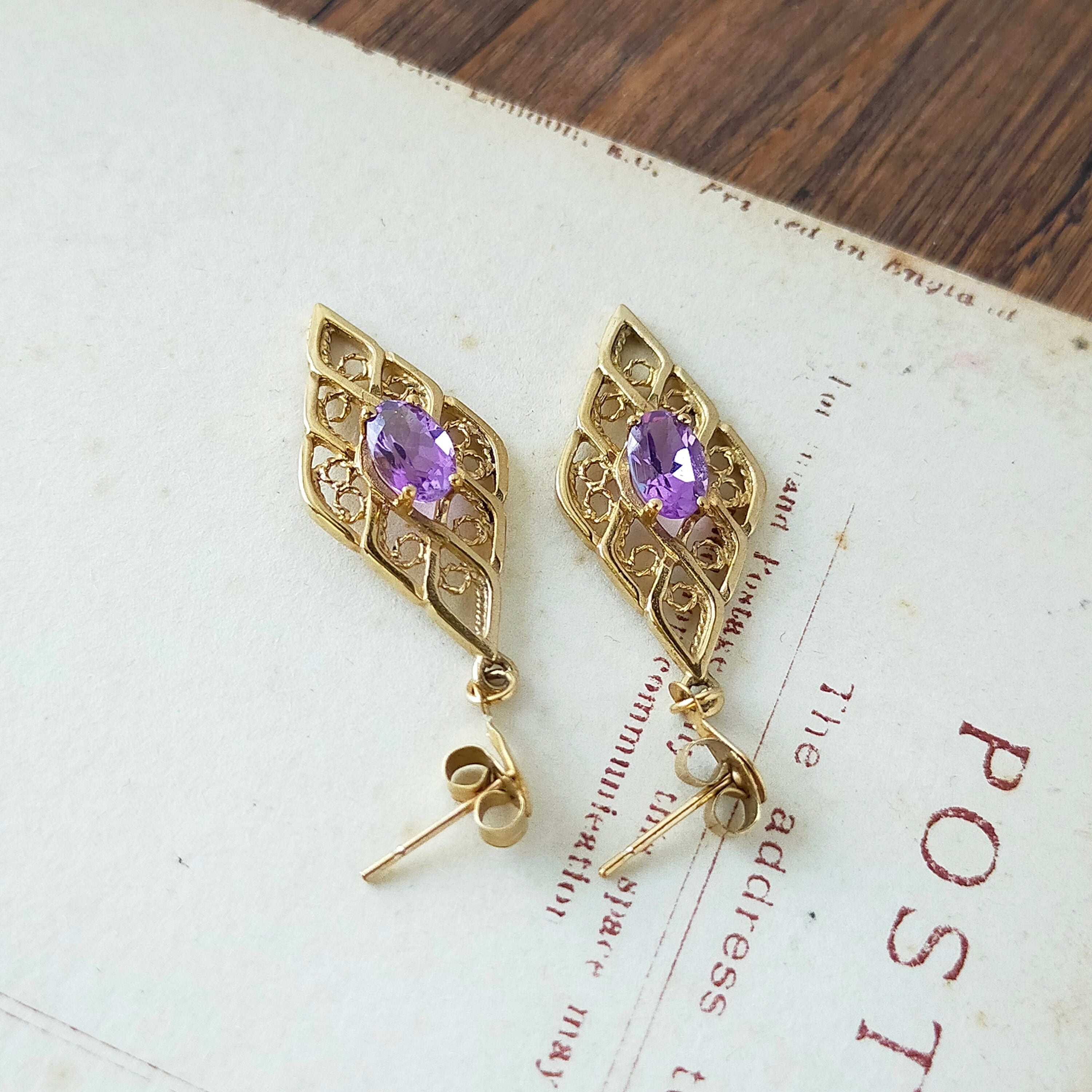 ヴィンテージ 9ct ゴールド アメジスト ピアス フィリグリー