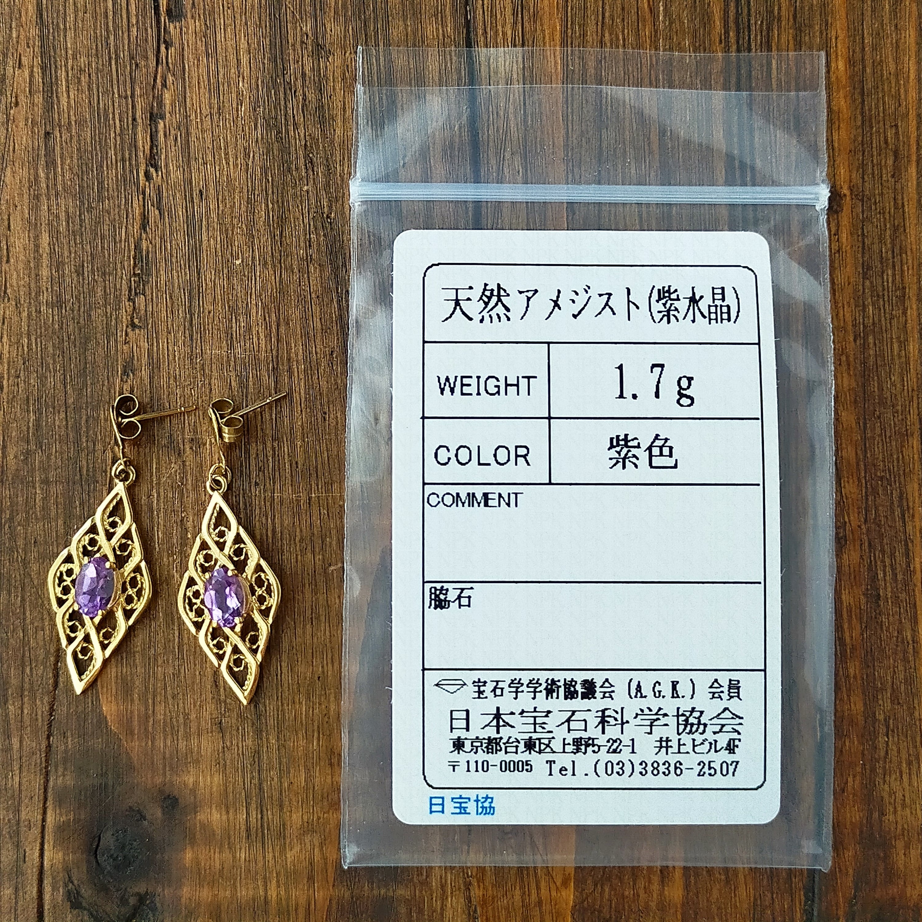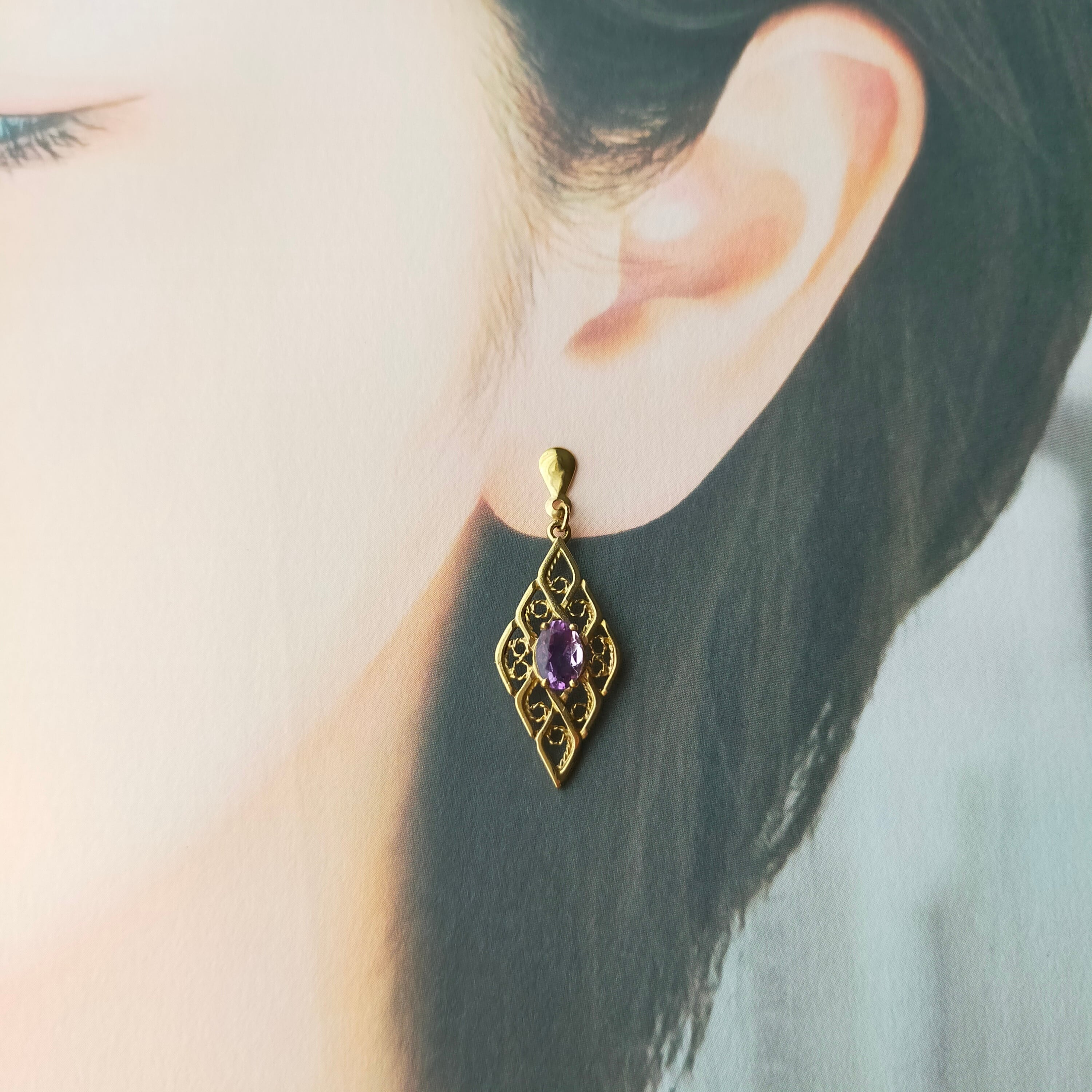 アメジストの上品な輝きと、ひし型のフィリグリーが繊細。