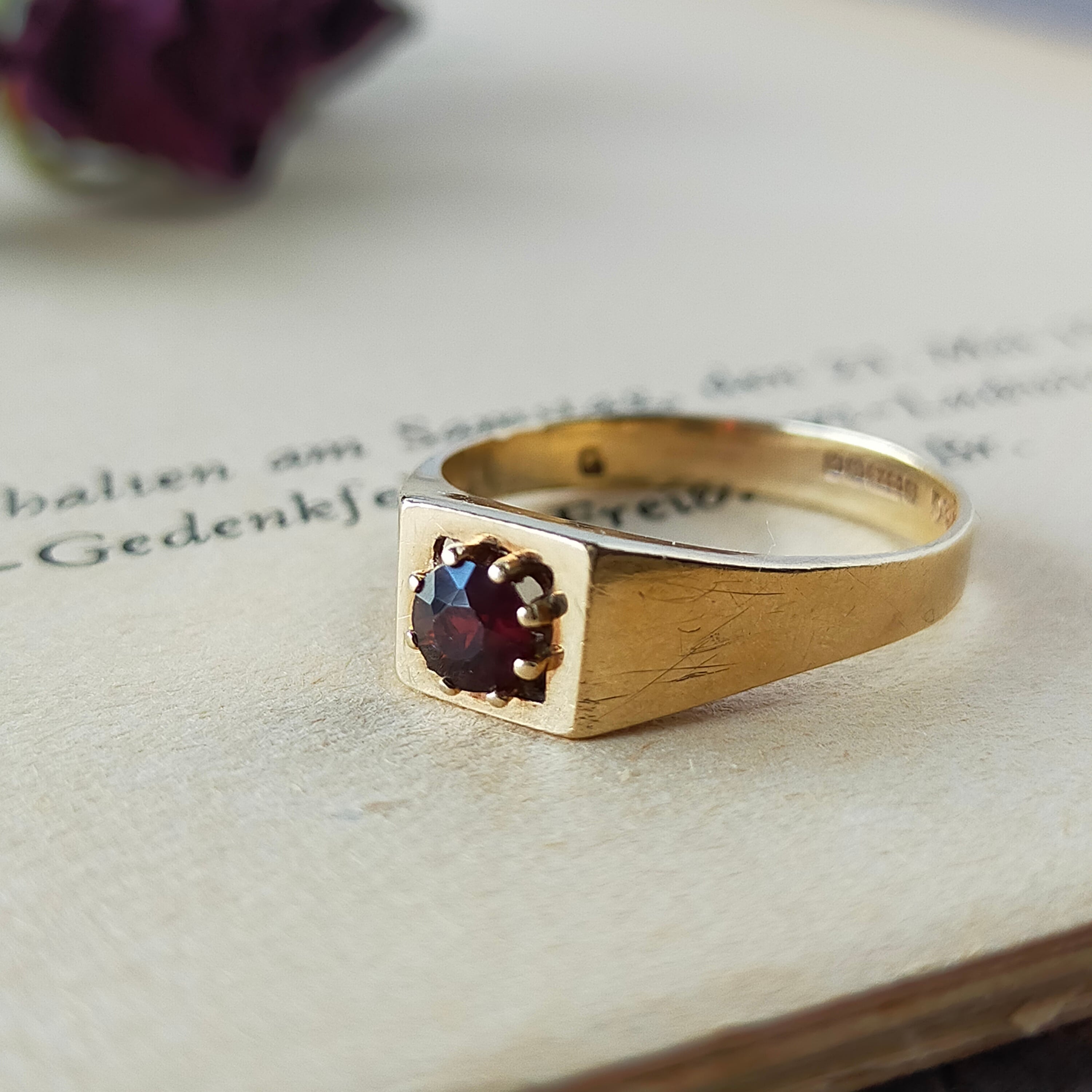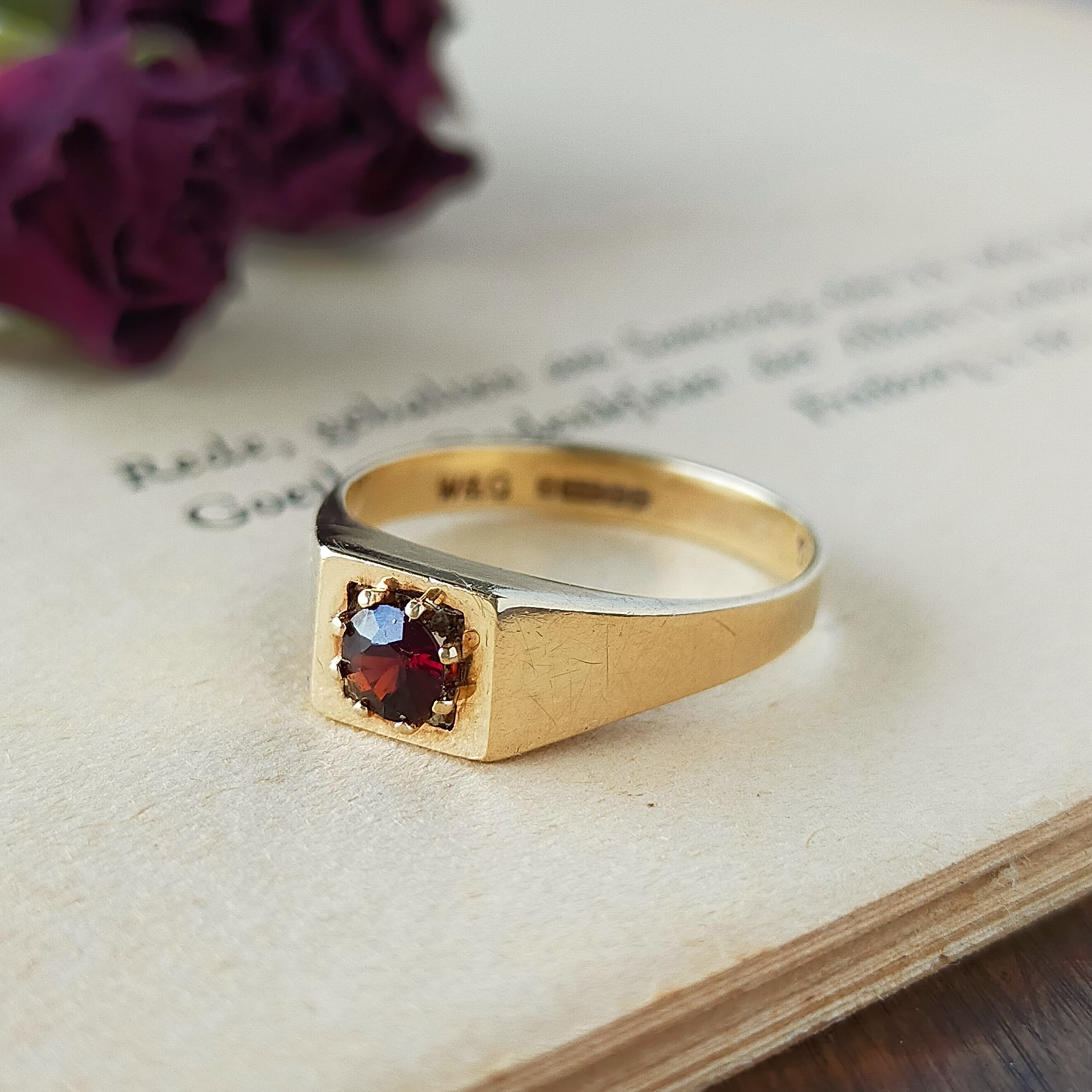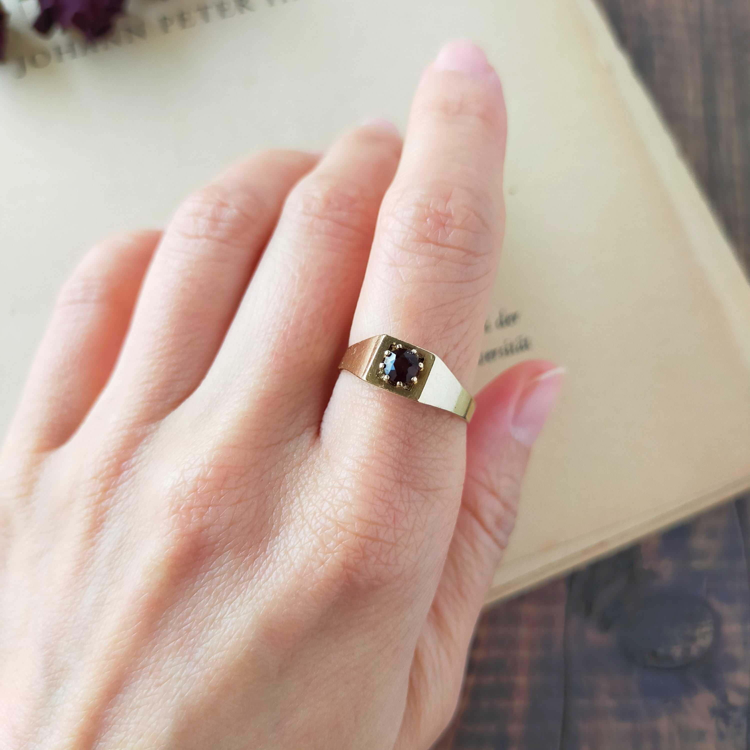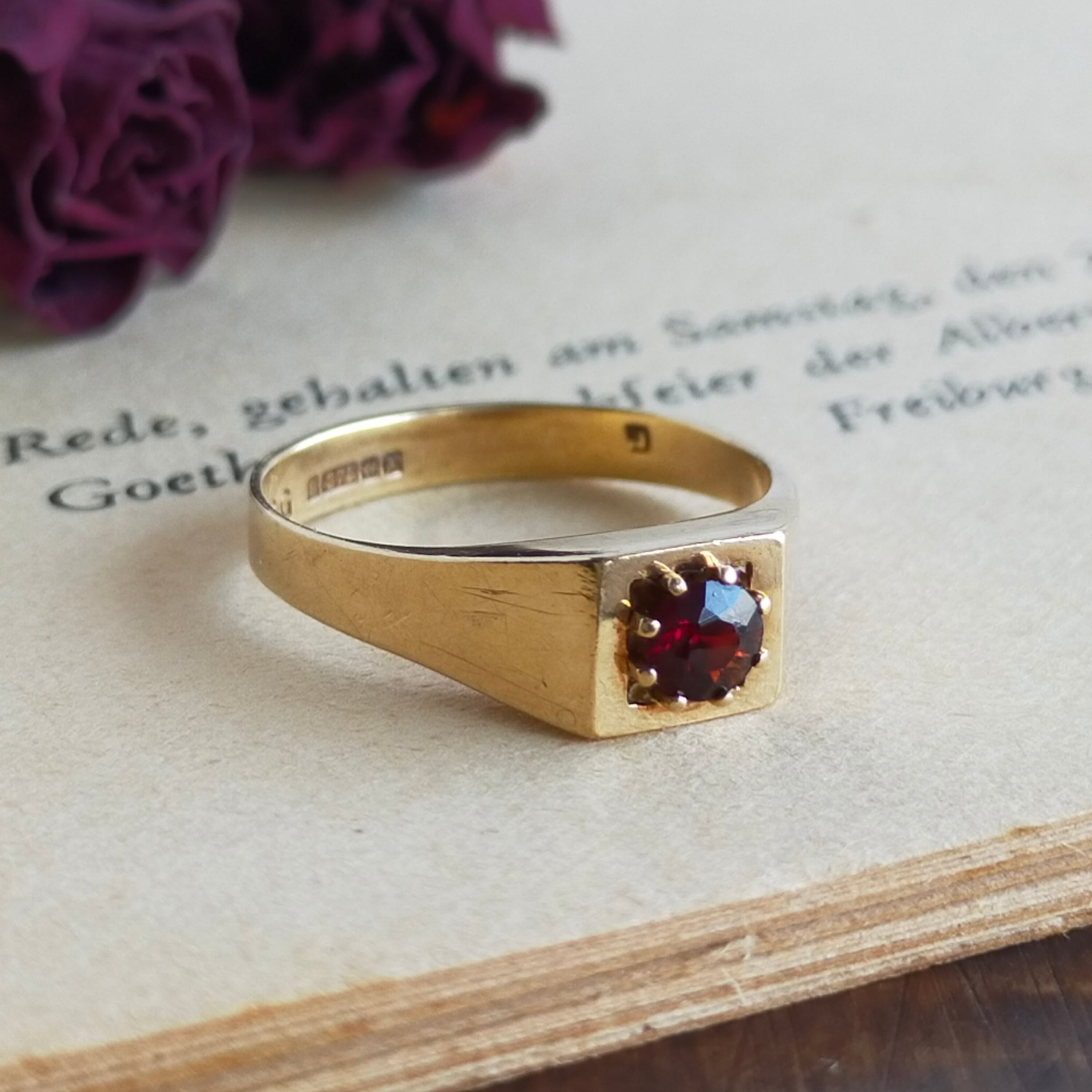 英国 1972年 ヴィンテージ 9kゴールド ガーネット シグネットリング スクエア バーミンガム