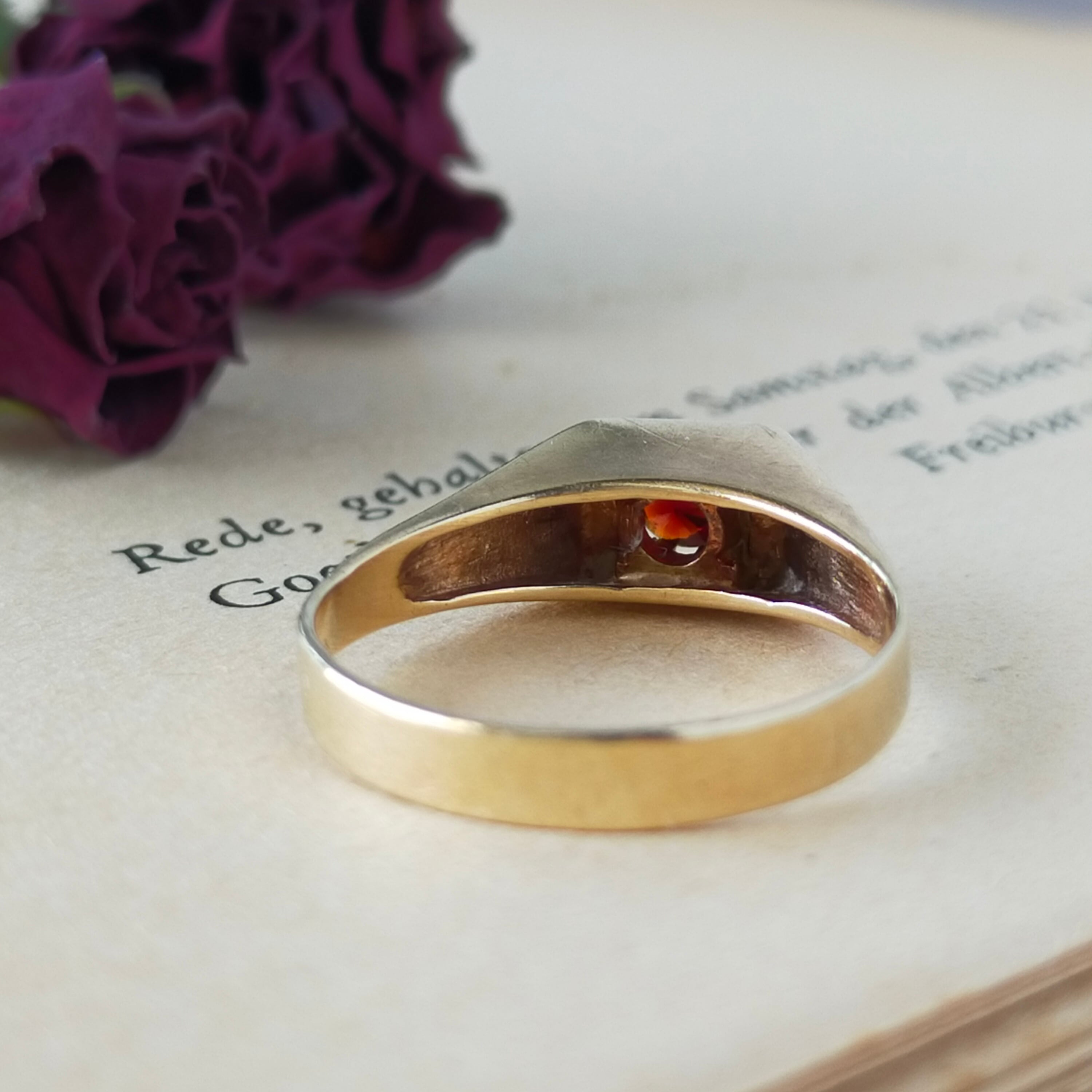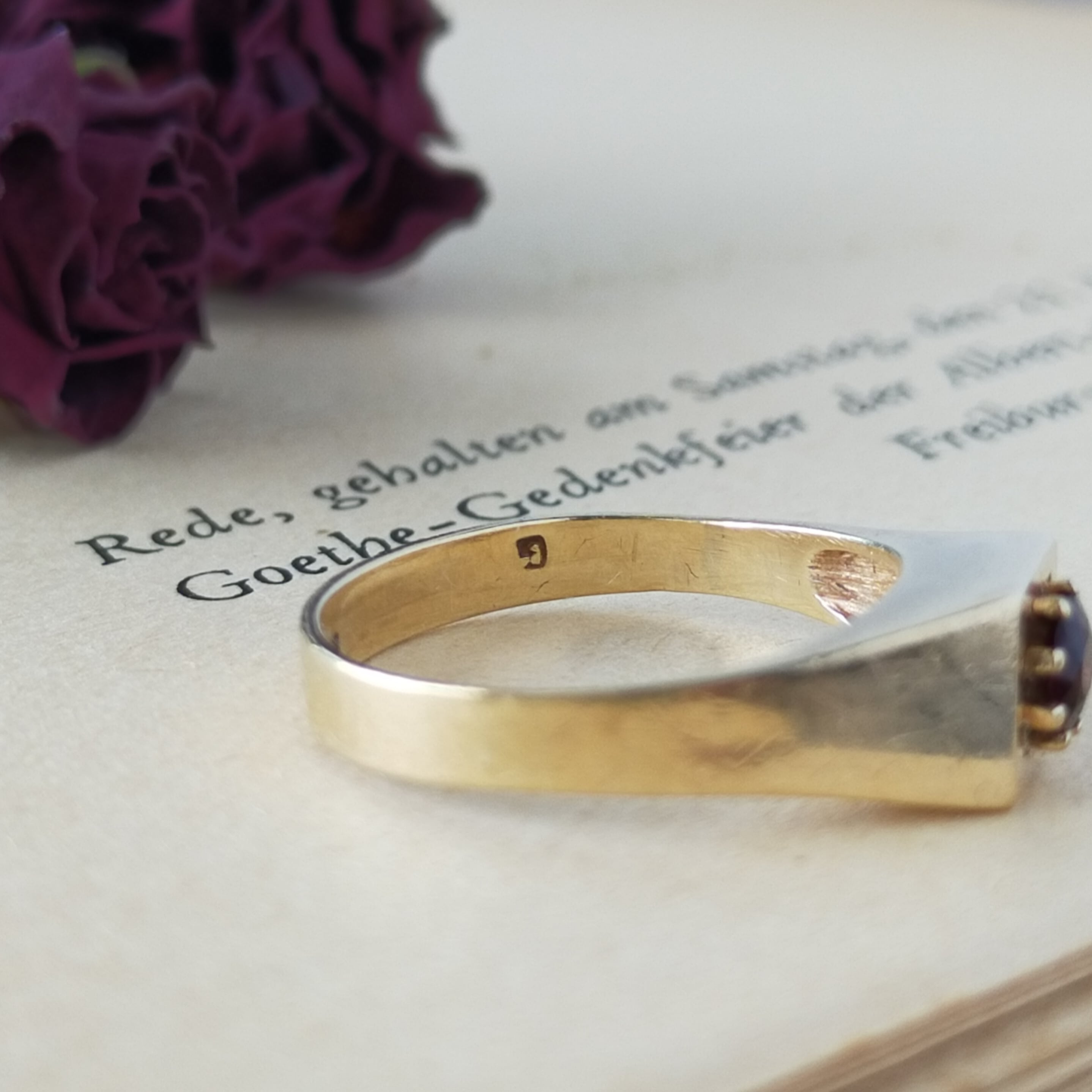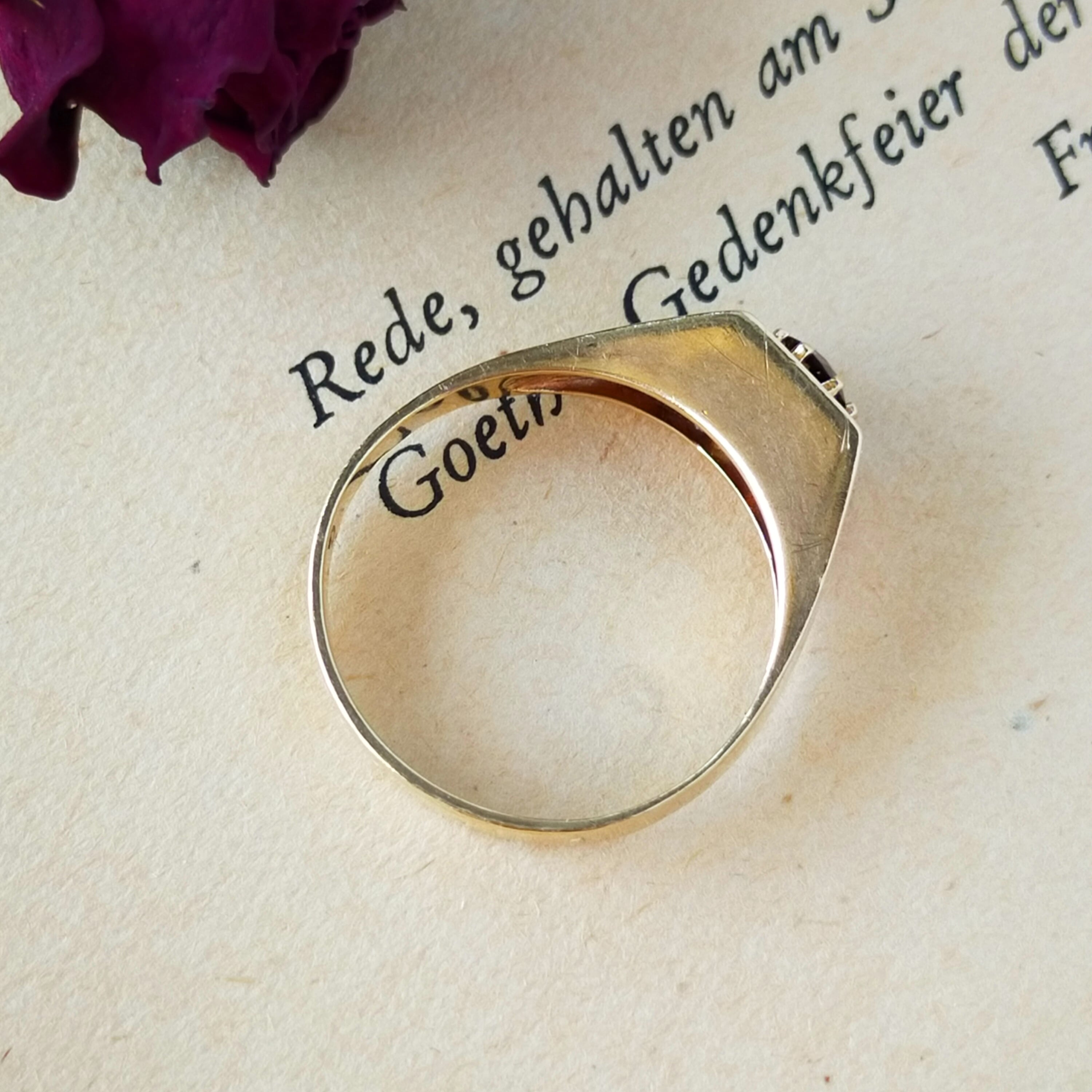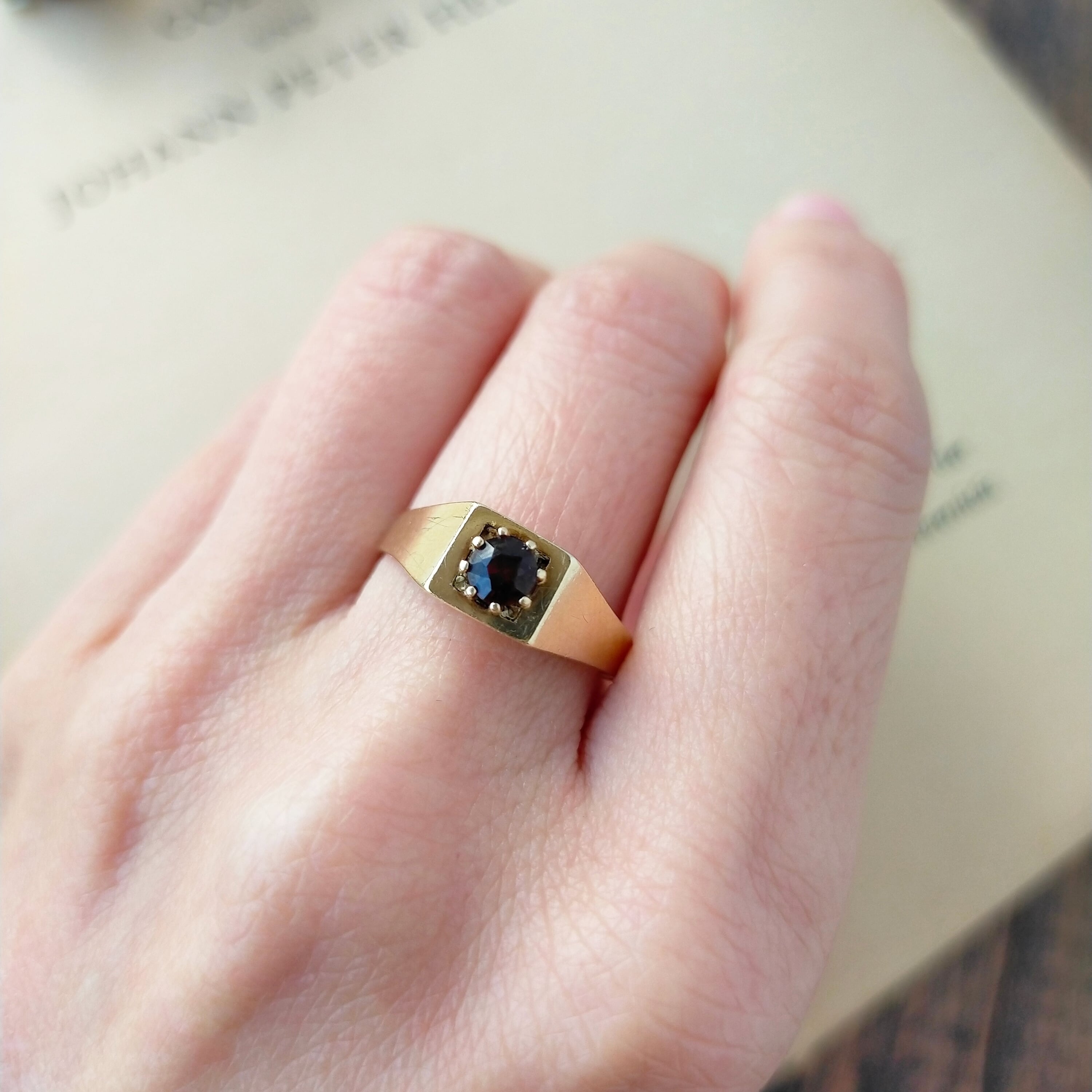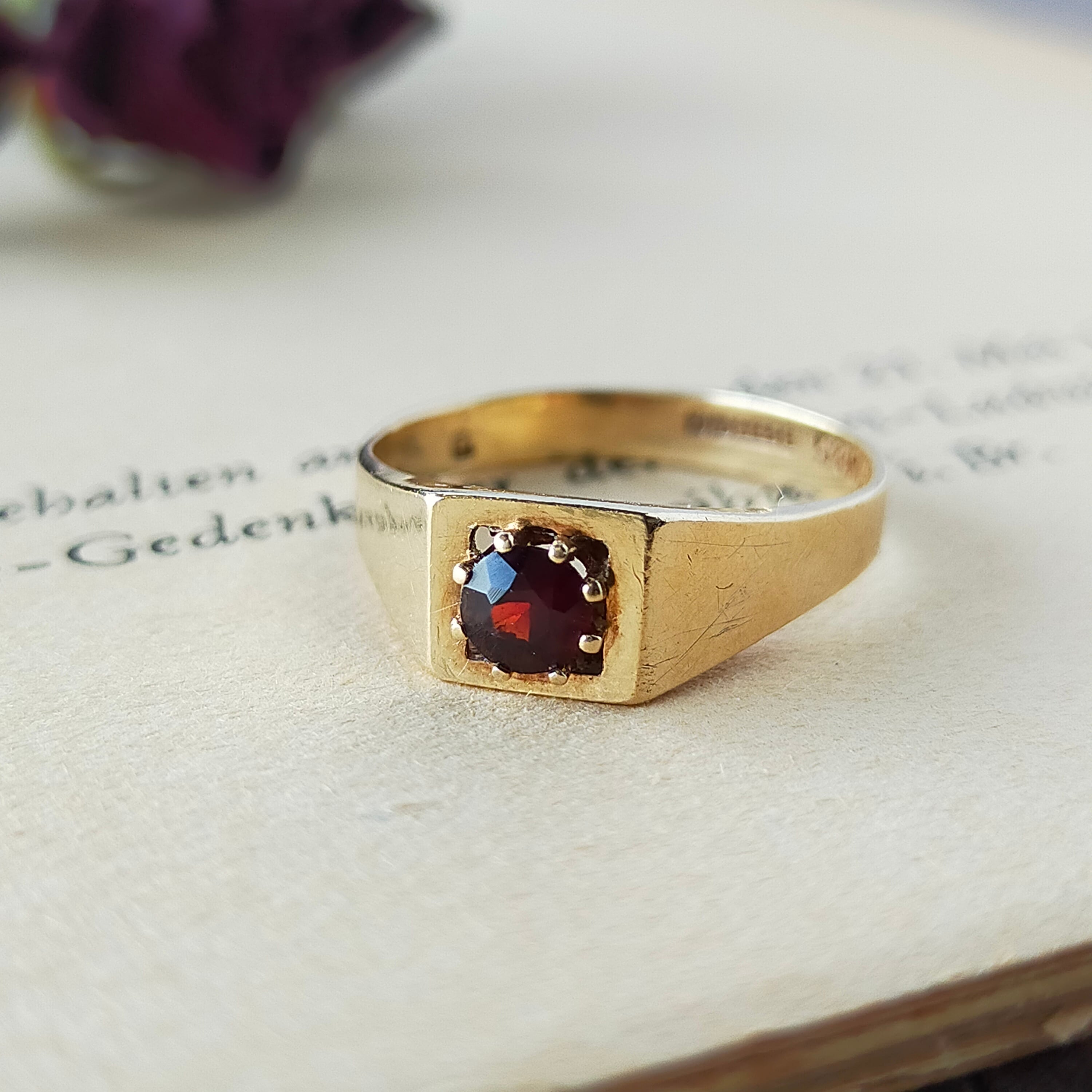 英国 1972年 ヴィンテージ 9kゴールド ガーネット シグネットリング スクエア バーミンガム