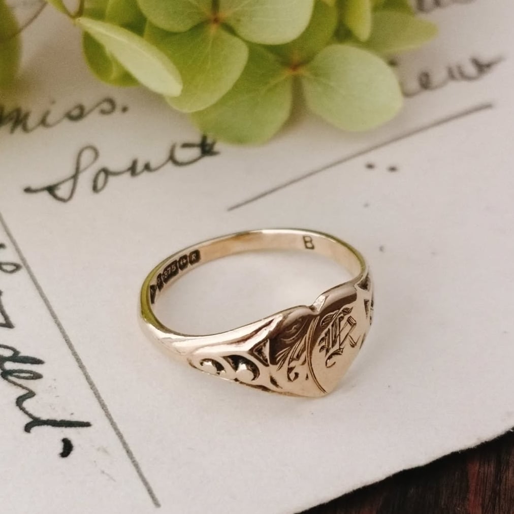 英国 ヴィンテージ 9kゴールド ハート イニシャル 唐草模様 シグネットリング