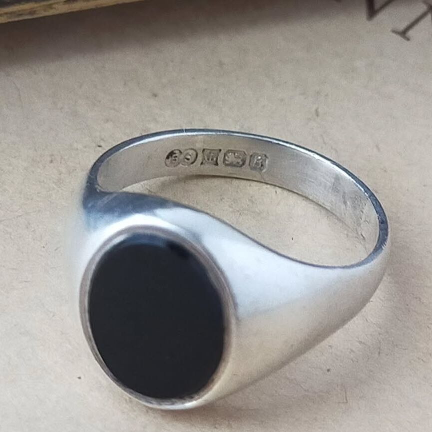 英国 1976年 ヴィンテージ 925スターリングシルバー オニキス シグネットリング ホールマーク オーバル