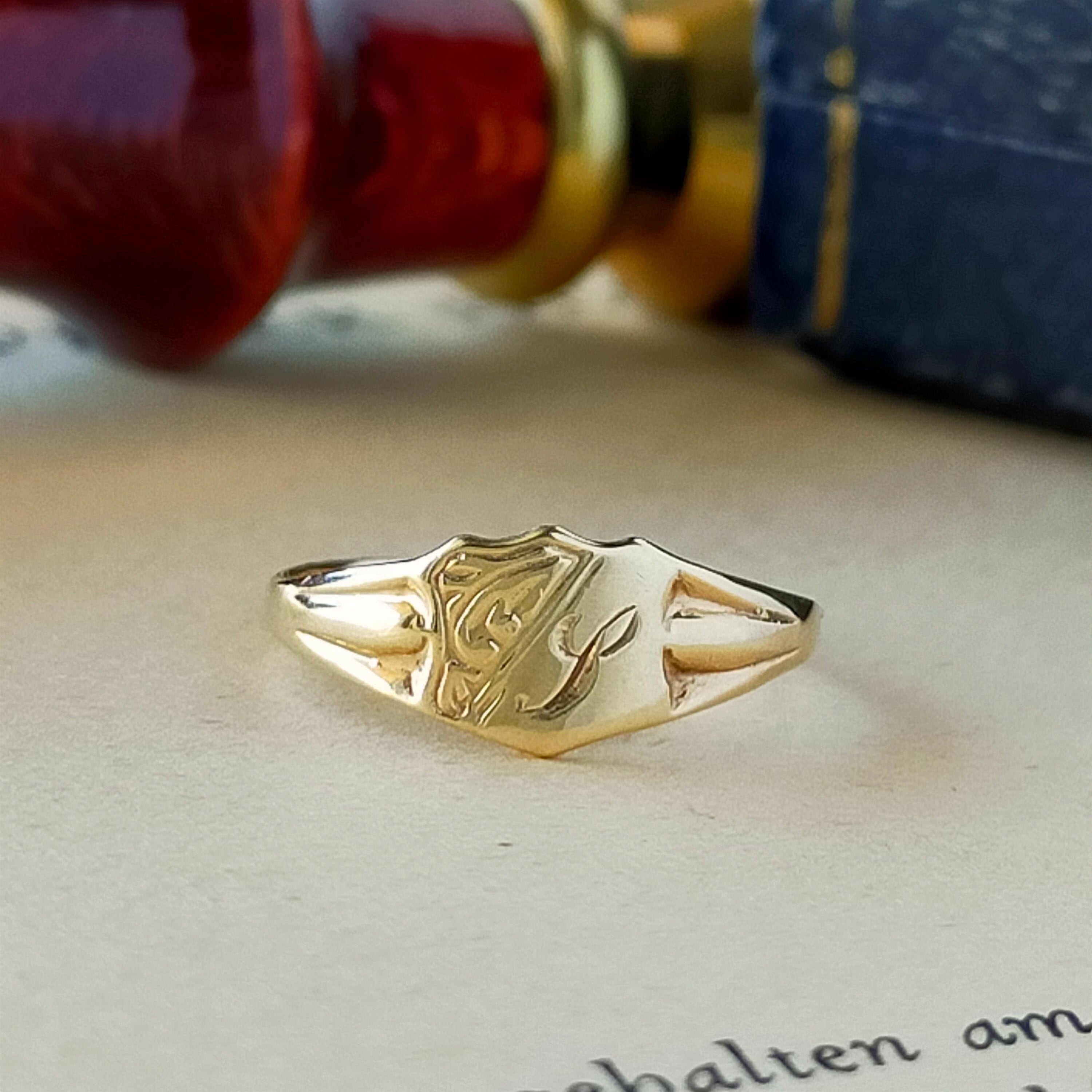 英国 1984年 ヴィンテージ 9kゴールド "I"イニシャル シールド型 シグネットリング ホールマーク